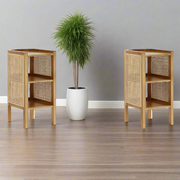Furnishiaa Natural Rattan Bedside End Table with 2 Shelf Storage, Set of 2, Natural Cane - Natural / Set of 2